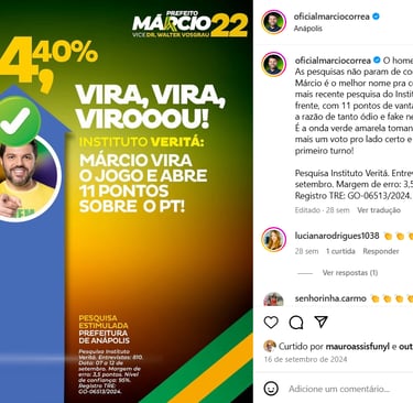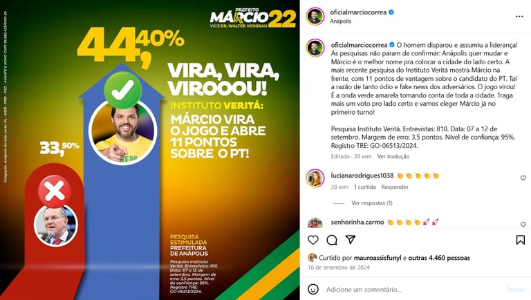 A eleição municipal de Anápolis em 2024 foi um reflexo da polarização nacional. De um lado, o candidato do PL, Márcio Corrêa. Dentista, empresário da construção civil, deputado estadual e suplente federal por quatro meses. Do outro, o petista Antônio Gomide. Também dentista, deputado estadual em exercício e ex-prefeito da cidade, com forte recall e liderança nas pesquisas. De um lado, o “novo horizonte”. Do outro, o “porto seguro”. E no meio, uma população cansada do abandono da cidade e arrependida por votar num desconhecido na onda bolsonarista de 2020. Gomide começou com 46% das intenções de voto, contra 20% de Márcio. No primeiro turno, o lado certo virou o jogo: Márcio terminou com 49,59% dos votos válidos, contra 35,45% de Gomide. No segundo turno, foi só manter o rumo: Márcio Corrêa foi eleito prefeito com 58,56% dos votos, 31 mil a mais que o petista.